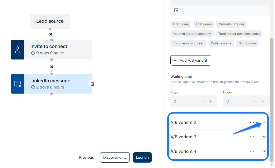 - In SCALEUP, you can test different parts of your message copy, such as LinkedIn messages, Emails, InMails, Invites to Connect, or even the timing between the steps during the campaign sequence creation process. You can create up to 5 different test variants!